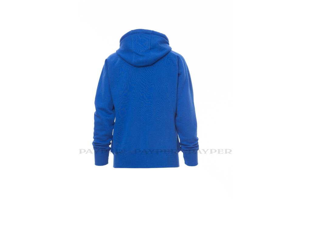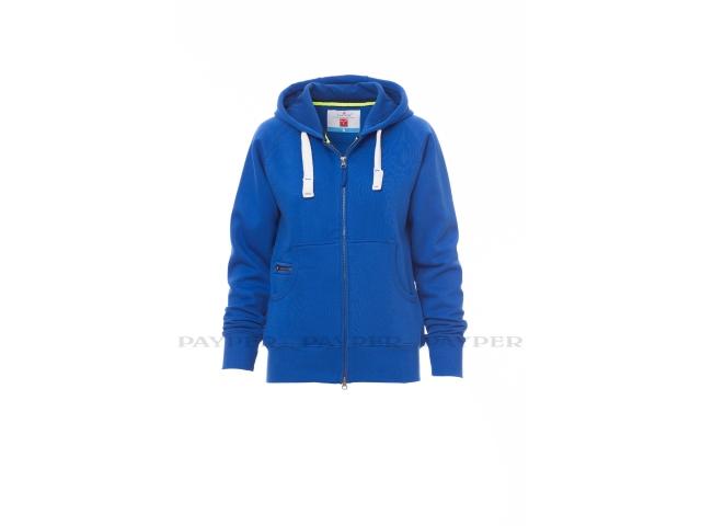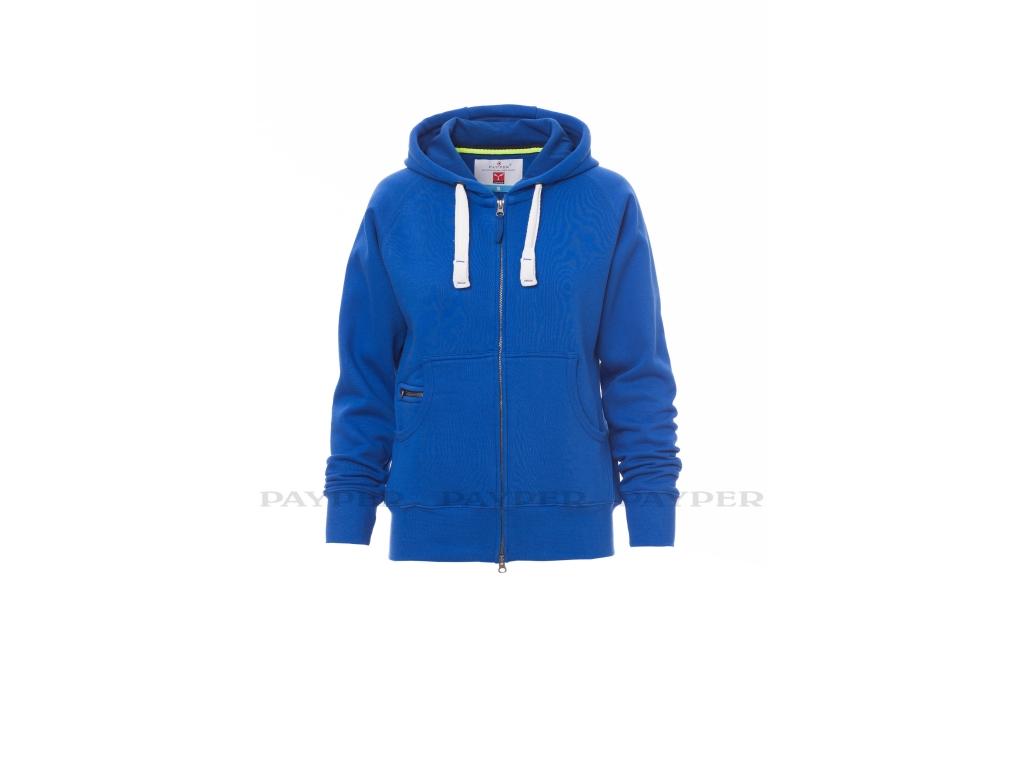 Prigludęs moteriškas džemperis su viso ilgio, plastiku dengtu SBS užtrauktuku su dviguba metaline galvute, gobtuvu su dvigubomis siūlėmis ir baltu raišteliu su kontrastingu dygsniavimu bei metaliniais žiedais, reglano rankovėmis, didelėmis kišenėmis, mažomis kišenėmis su užtrauktuku, tampriais stulpelių rašto rankogaliais ir juosmeniu, sutvirtintomis siūlėmis.